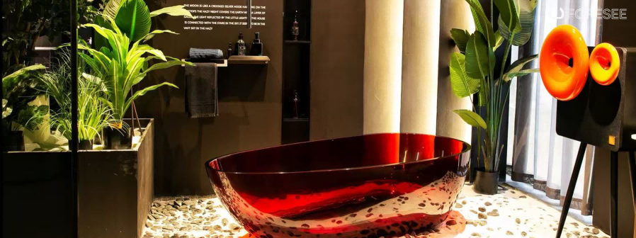 In bathroom, the horn speaker is the star of the show as a creator of bold aesthetic tension. An orange-red horn set against a sleek matte black backdrop creates an eye-catching visual clash that draws the gaze immediately. It’s a thoughtful application of sensory contrast that transforms the entire space, making it feel more dynamic and intentional. Amid the sharp geometric lines of mirror walls and freestanding bathtubs, the speaker’s organic curves and vivid hue stand in beautiful opposition.