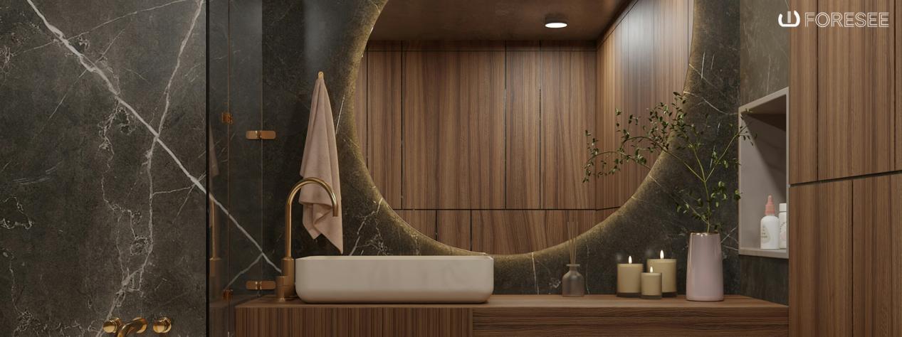 Materials such as brushed metal, glass, and polished stone complement the light luxury aesthetic while maintaining durability in humid conditions.